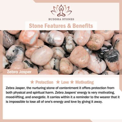 Zebra Jasper. the nurturing stone of contentment it offers protection from both physical and spiritual harm. Zebra Jaspers’ energy is very motivating. mood-lifting. and energetic. It carries within it a reminder to the wearer that it is impossible to lose all of one’s energy and love by giving it away.